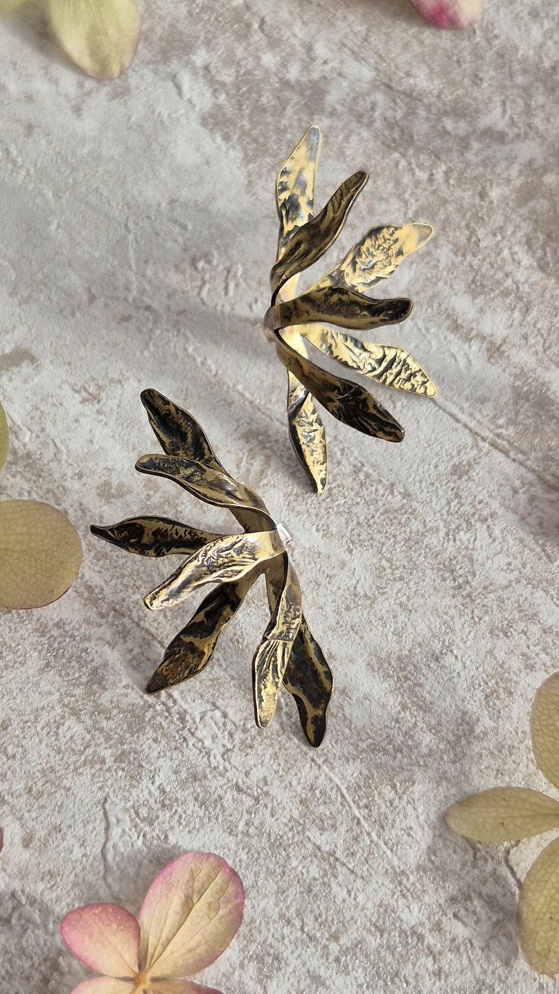 Mosiężne, ze srebrnymi (próba 925) sztyftami oraz barankami. Wykonane ręcznie, oksydowane, aby podkreślić piękną fakturę. Dla kobiety, która lubi niebanalne dodatki.