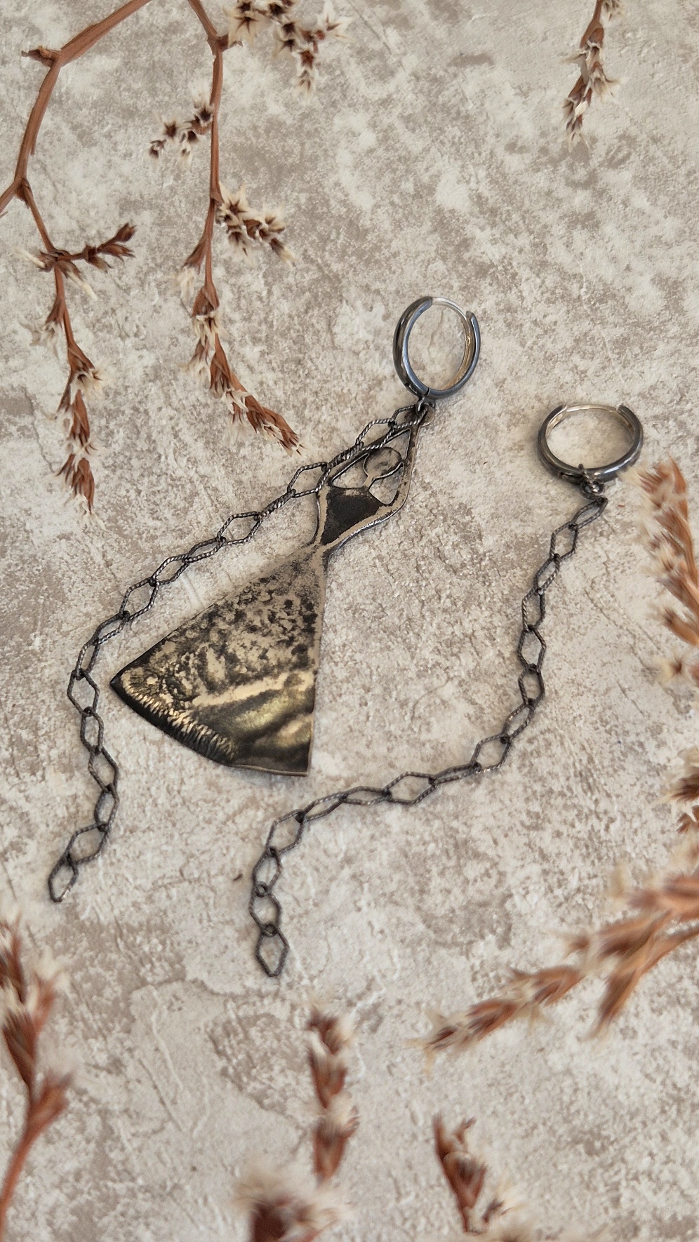 Asymetryczne, ręcznie wykonane, srebrne (próby 925) kolczyki w intrygującym kształcie. Niezwykle piękna, nietuzinkowa, autorska biżuteria, wpadająca w oko! Oksydowane dla podkreślenia faktury.
